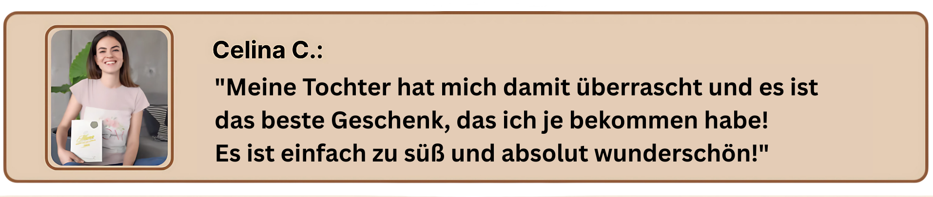 Das Buch ist eine wunderbare Geschenkidee, besonders für Anlässe wie Geburtstage, Muttertage oder andere besondere Momente. Es bietet eine einzigartige Möglichkeit, persönliche Geschichten und Erinnerungen festzuhalten und ein bleibendes Vermächtnis zu schaffen, das über Generationen hinweg geschätzt wird. Die Lieferung dauert 5 Werktage. In seltenen Fällen kan