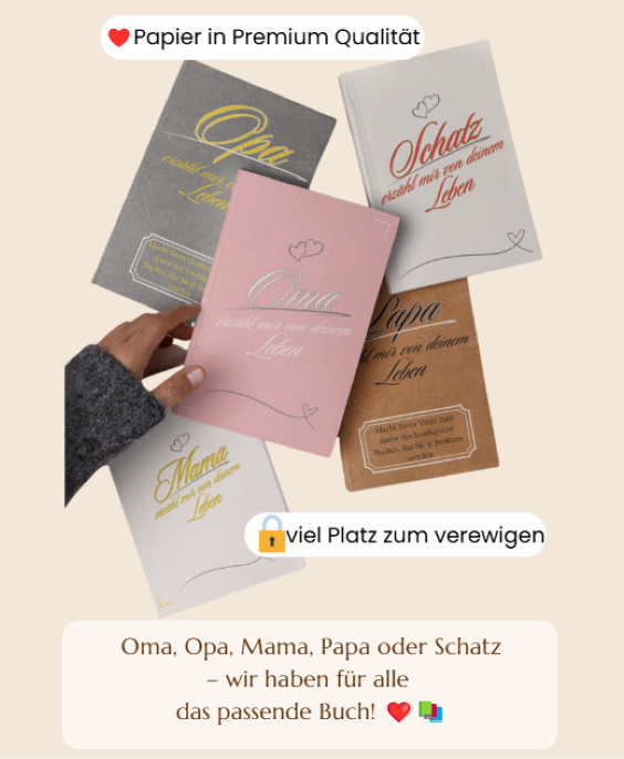Keine Sorge! Die geführten Fragen und klaren Anleitungen machen es leicht, deine Lebensgeschichte zu teilen, ohne dich überfordert zu fühlen. Du musst kein großartiger Schreiber sein, um deine Erinnerungen festzuhalten.