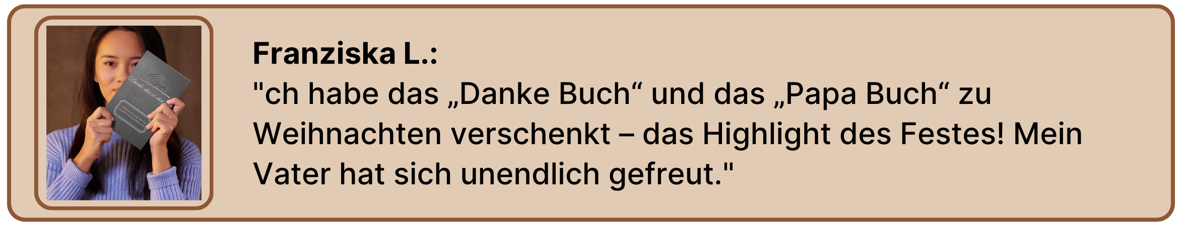 Keine Sorge, du musst kein preisgekrönter Schriftsteller sein! Die geführten Fragen und Anregungen nehmen dich an die Hand und helfen dir dabei, deine Dankbarkeit und Gedanken leicht auszudrücken. Oft reicht schon ein kurzer Satz oder sogar ein Stichwort, um kostbare Erinnerungen festzuhalten. Dabei geht es vor allem um Ehrlichkeit und Gefühl – nicht um perfekte Formulierungen.