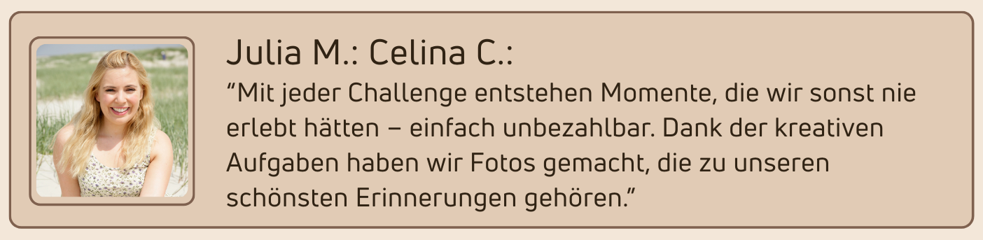 Die Challenges laden euch ein, Zeit miteinander zu verbringen und dabei zu lachen. Jede Aufgabe stärkt eure Verbindung und schafft unvergessliche Erinnerungen.